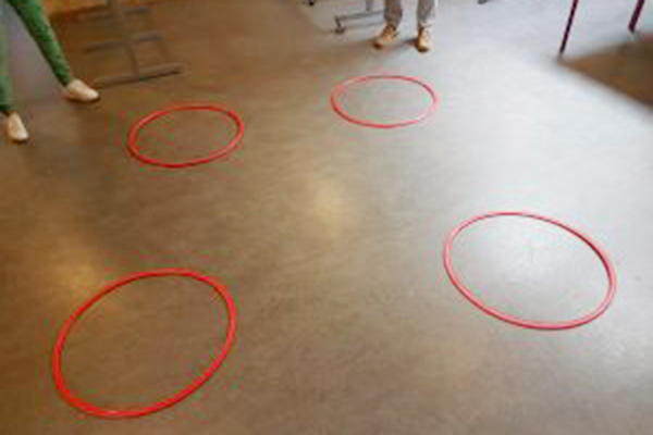 ‘Jazeker’, antwoord ik, ‘wacht even’ en ik loop weg om wat te pakken. Teruggekomen leg ik een wat dikker wit touw in een ruime boog om Meyke. Ik blijf zelf buiten haar ruimte. ‘Dit is jouw ruimte, hier is de grens, hier stop jij en hier begin jij’. Ik vraag haar de uitstraling van de ander vast te pakken. Meykes handen sluiten zich. Ik vraag het pakketje aan mij te geven. Nadat ik het aangepakt heb, gebruik ik mijn lichaam als fysieke grens tussen Meyke en het pakketje. ‘Wat wil je dat ik ermee doe?’ Het moet in de prullenbak. Ik sta op en loop de ruimte uit naar de dichtstbijzijnde prullenbak. De deur blijft open en ik laat het deksel met opzet dichtvallen. Ik loop terug naar Meyke, die zichtbaar opgelucht, kan gaan schrijven in haar reflectieboekje. Daar is ze wel even zoet mee.
