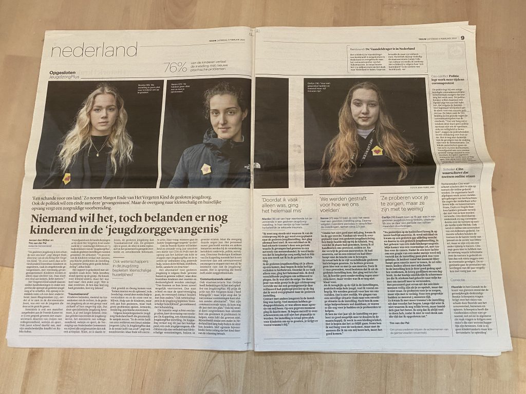 In de Trouw van 5 februari 2022 stond op de voorpagina een artikel aangekondigd met als titel: ‘Opgroeien in een gesloten instelling’ en met bijschrift: ‘Je krijgt er vooral trauma’s bij, zeggen jongeren’. In het artikel komen Nienke (18 jaar, ‘De instelling is geen plek om op te groeien’),